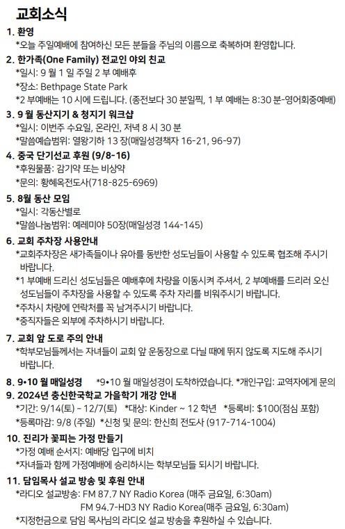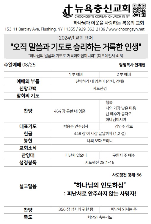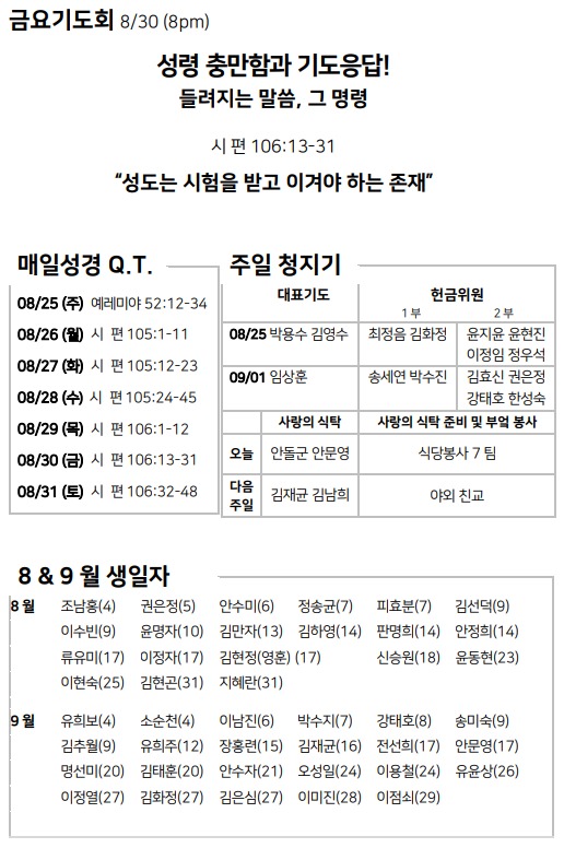 8월 25일 주일예배 주보 Aug 24, 2024 0 Comment Post By:CSKC Share: Prev Next You Might Also Like 18 Oct 2025 0 10월 19일 주일예배 주보 11 Oct 2025 0 10월 12일 주일예배 주보 5 Oct 2025 0 한마음 10월 기도제목