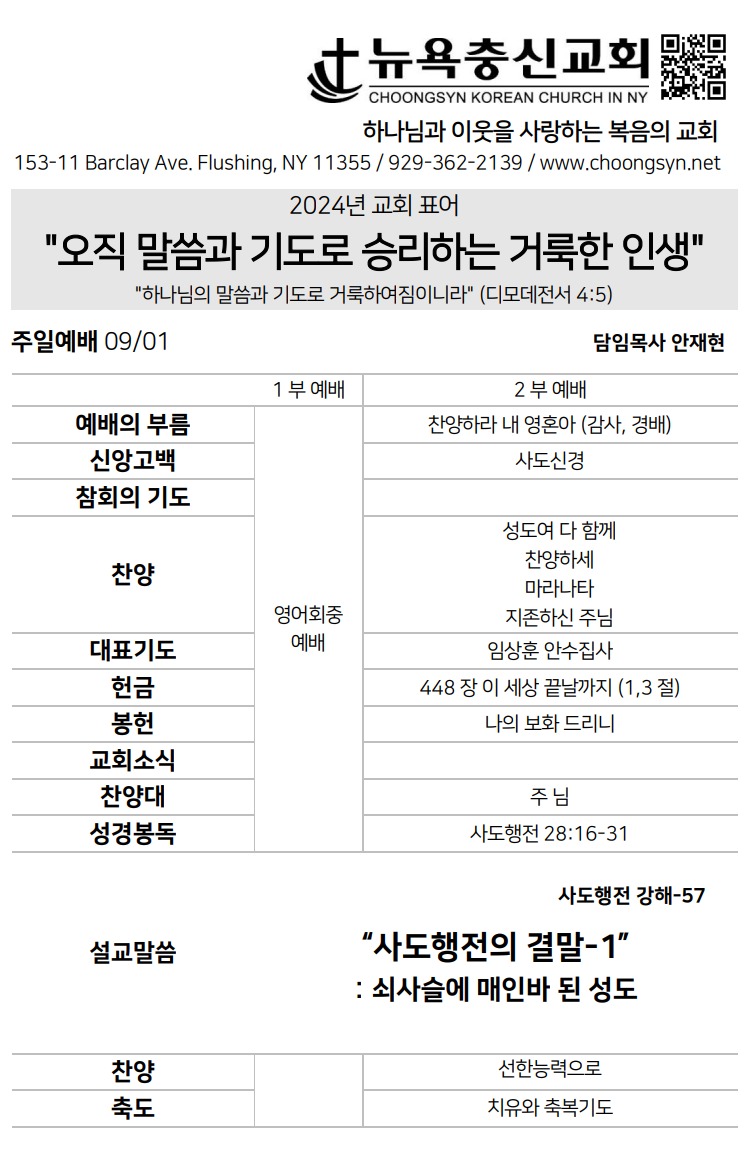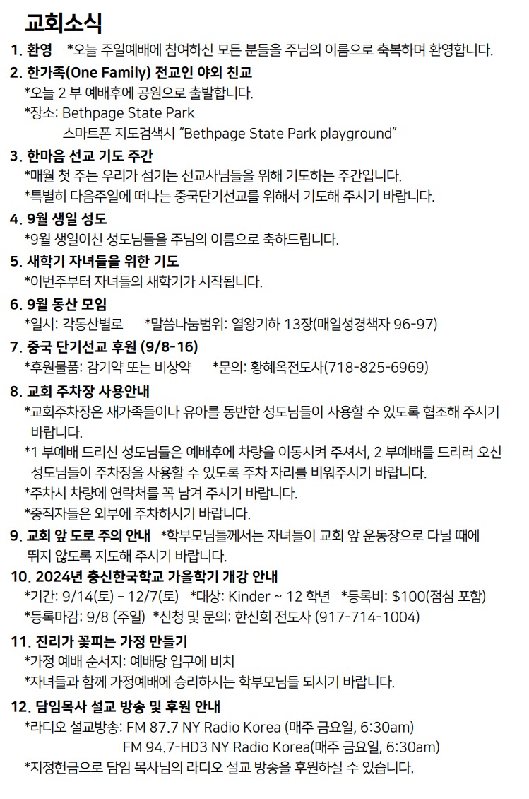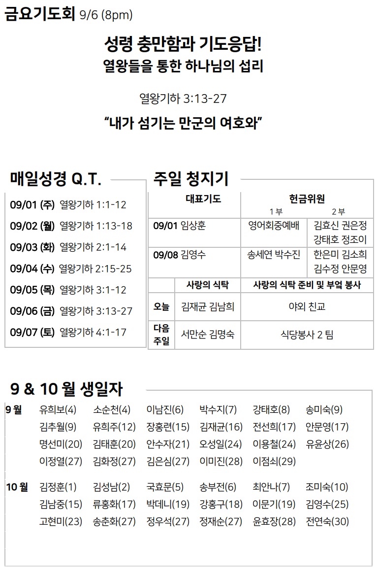 9월 1일 주일예배 주보 Sep 1, 2024 0 Comment Post By:CSKC Share: Prev Next You Might Also Like 18 Oct 2025 0 10월 19일 주일예배 주보 11 Oct 2025 0 10월 12일 주일예배 주보 5 Oct 2025 0 한마음 10월 기도제목