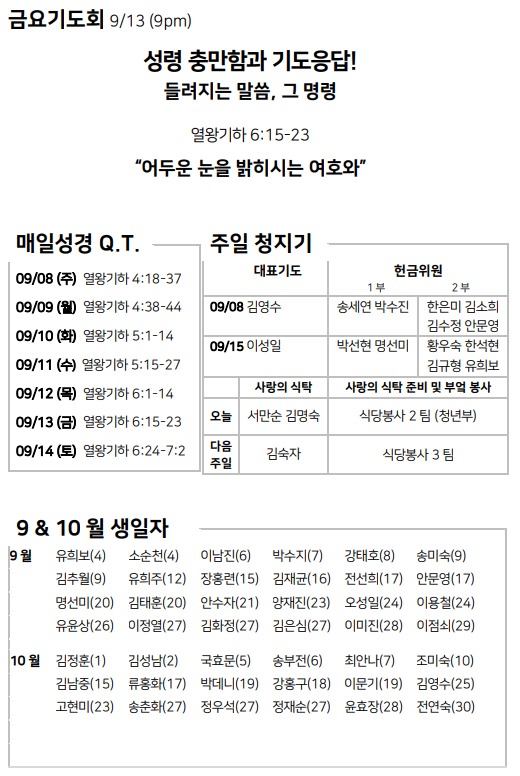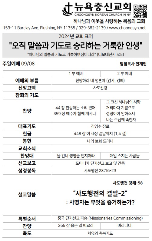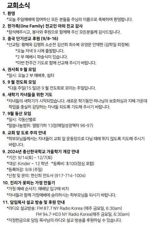 9월 8일 주일예배 주보 Sep 7, 2024 0 Comment Post By:CSKC Share: Prev Next You Might Also Like 18 Oct 2025 0 10월 19일 주일예배 주보 11 Oct 2025 0 10월 12일 주일예배 주보 5 Oct 2025 0 한마음 10월 기도제목