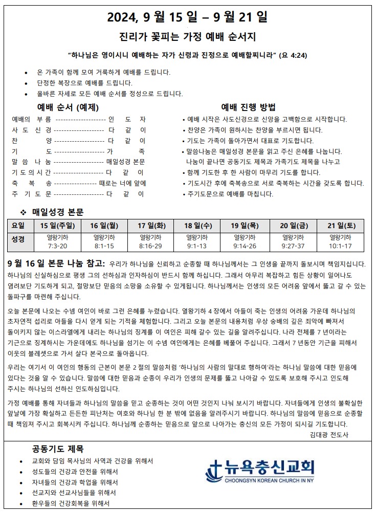 9월 3주차 가정예배지 Sep 14, 2024 0 Comment Post By:CSKC Share: Prev Next You Might Also Like 18 Oct 2025 0 10월 19일 주일예배 주보 11 Oct 2025 0 10월 12일 주일예배 주보 5 Oct 2025 0 한마음 10월 기도제목