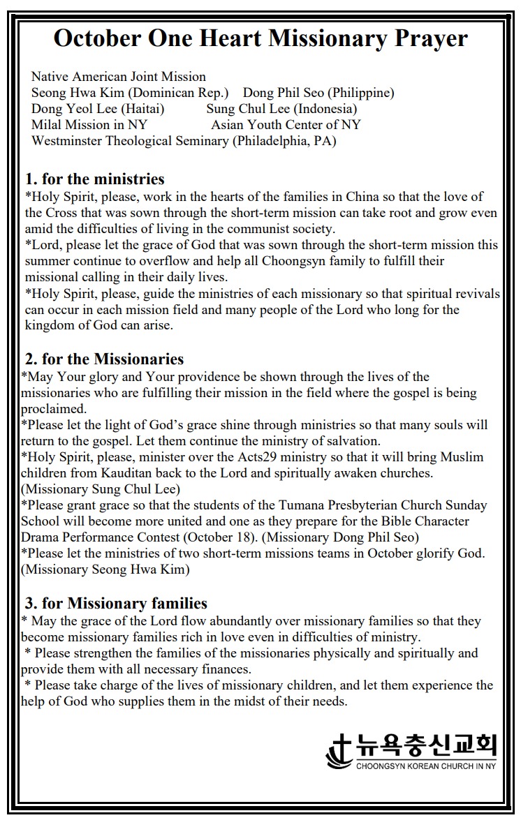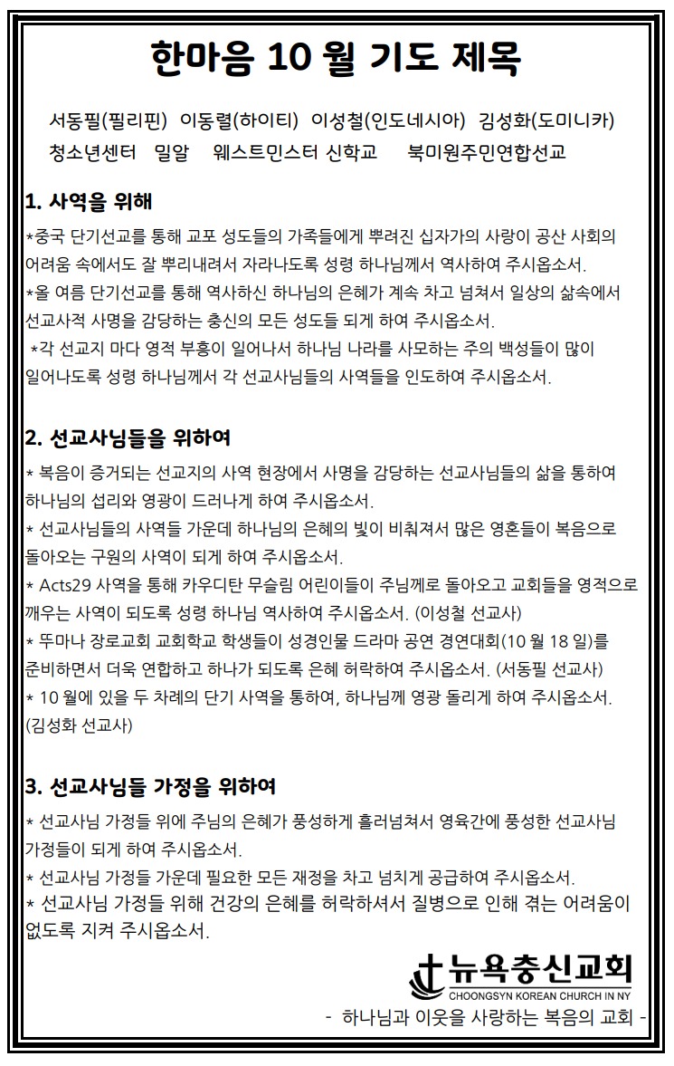 한마음 10월 기도제목 Oct 5, 2024 0 Comment Post By:CSKC Share: Prev Next You Might Also Like 18 Oct 2025 0 10월 19일 주일예배 주보 11 Oct 2025 0 10월 12일 주일예배 주보 5 Oct 2025 0 한마음 10월 기도제목