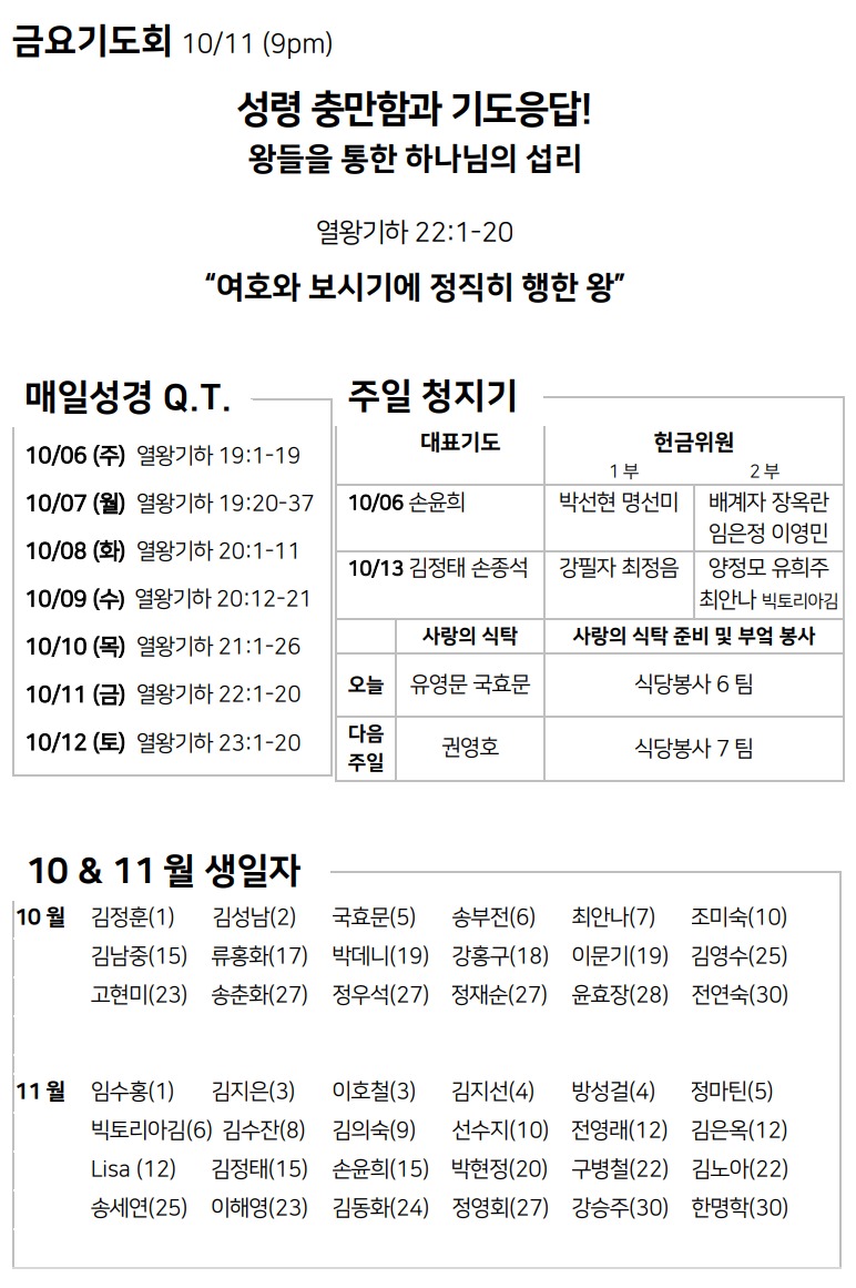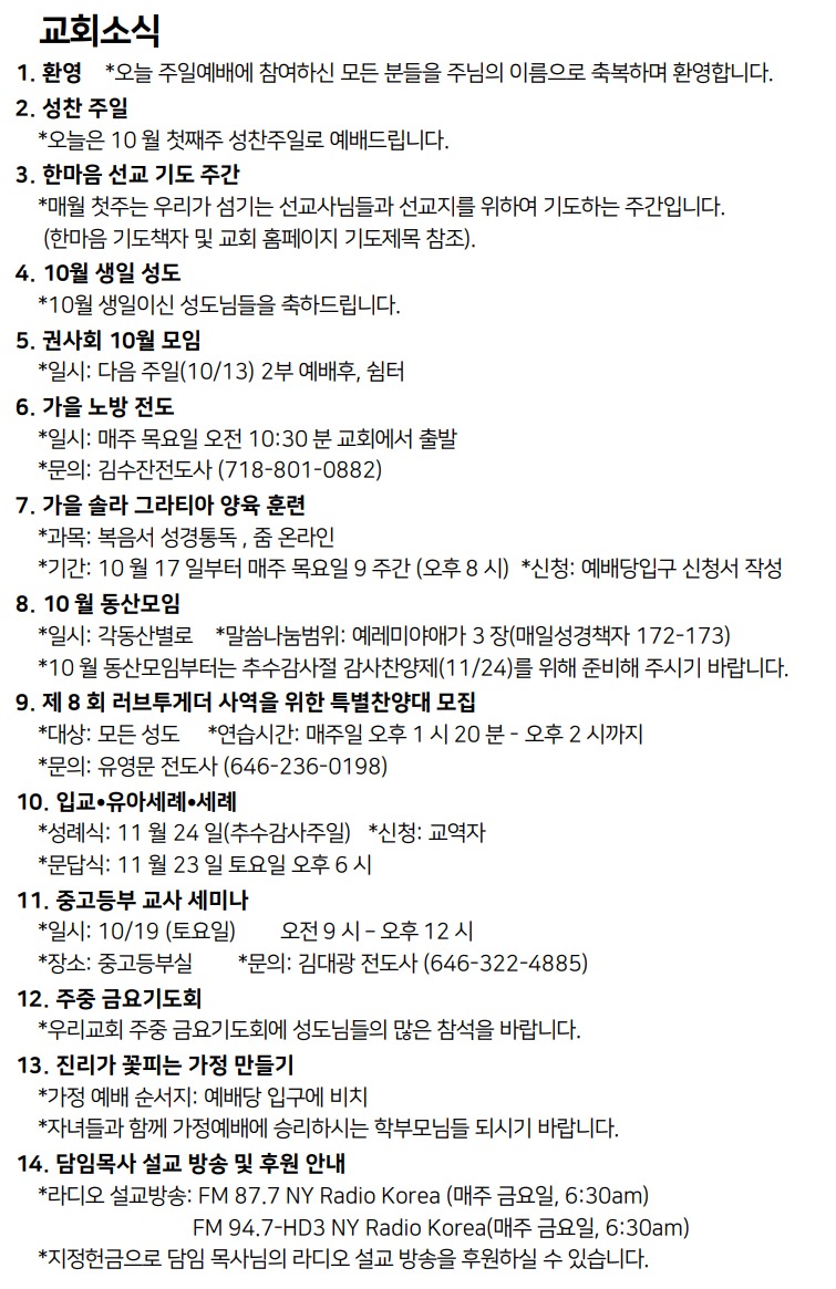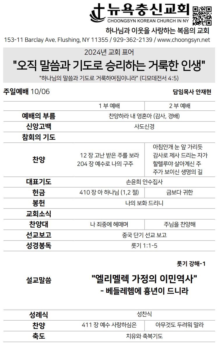 뉴욕충신교회 > 주보 > 10월 6일 주일예배 주보