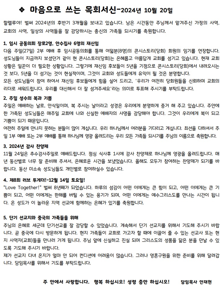10월 마음으로 쓰는 목회서신 Oct 19, 2024 0 Comment Post By:CSKC Share: Prev Next You Might Also Like 18 Oct 2025 0 10월 19일 주일예배 주보 11 Oct 2025 0 10월 12일 주일예배 주보 5 Oct 2025 0 한마음 10월 기도제목