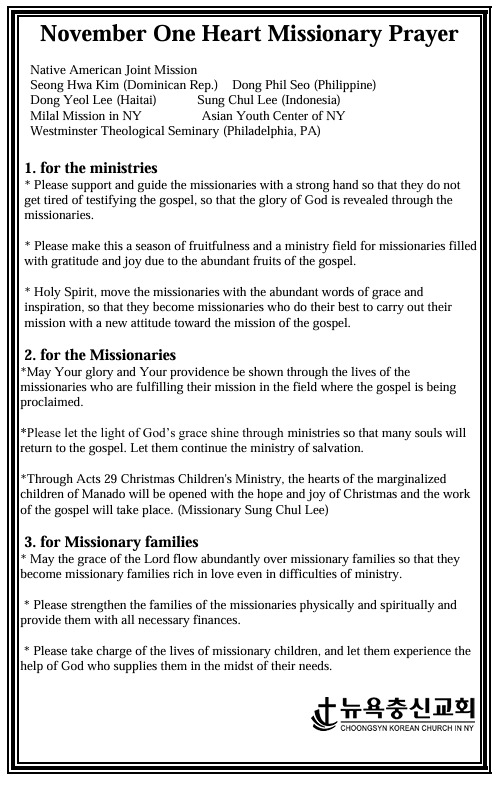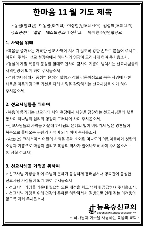 한마음 11월 기도제목 Nov 2, 2024 0 Comment Post By:CSKC Share: Prev Next You Might Also Like 18 Oct 2025 0 10월 19일 주일예배 주보 11 Oct 2025 0 10월 12일 주일예배 주보 5 Oct 2025 0 한마음 10월 기도제목