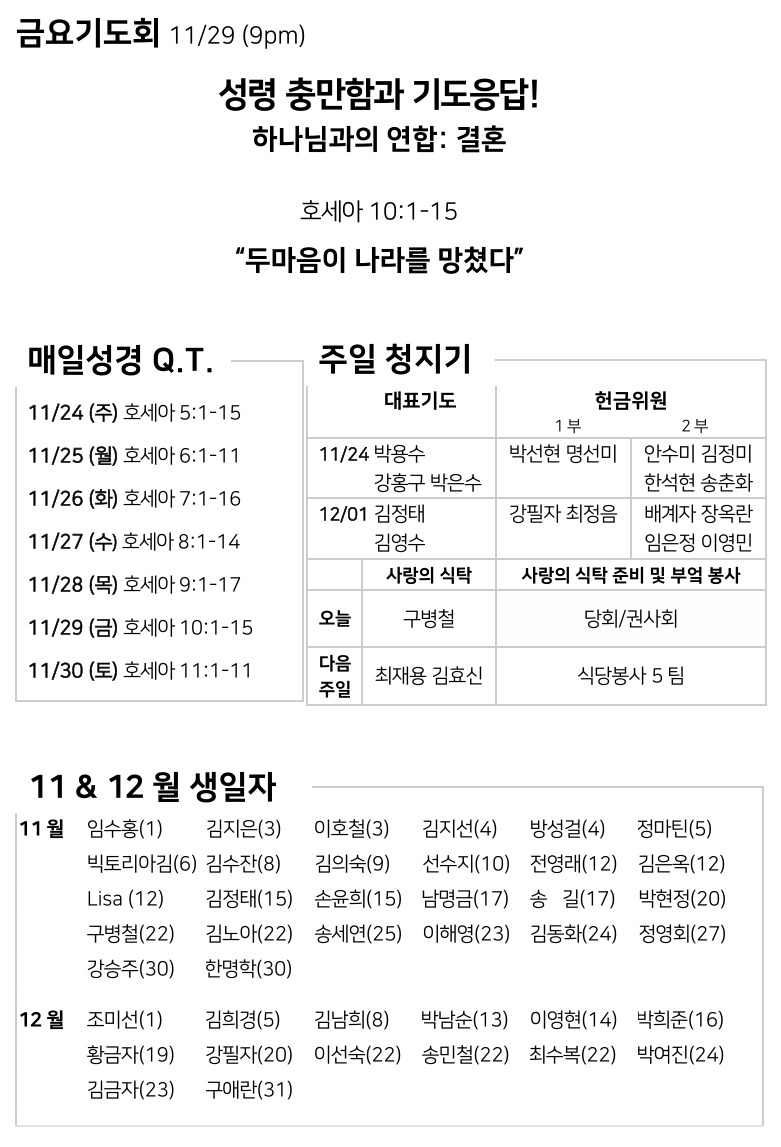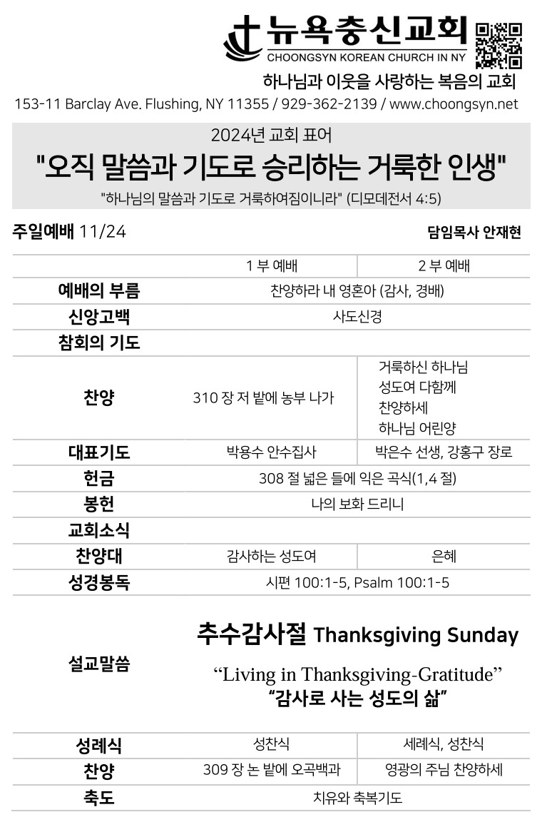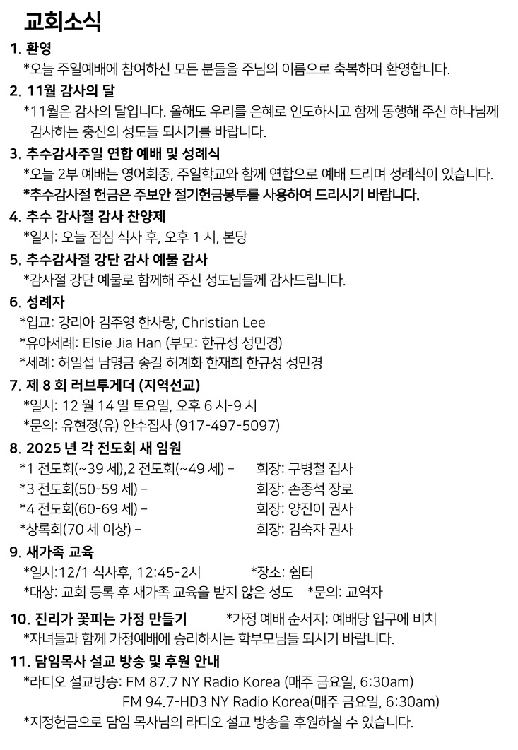 11월 24일 주일예배 주보 Nov 23, 2024 0 Comment Post By:CSKC Share: Prev Next You Might Also Like 18 Oct 2025 0 10월 19일 주일예배 주보 11 Oct 2025 0 10월 12일 주일예배 주보 5 Oct 2025 0 한마음 10월 기도제목