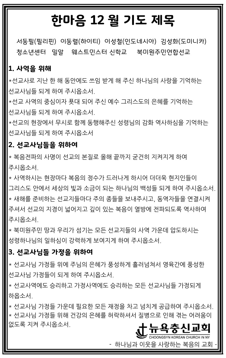 한마음 12월 기도제목 Nov 30, 2024 0 Comment Post By:CSKC Share: Prev Next You Might Also Like 18 Oct 2025 0 10월 19일 주일예배 주보 11 Oct 2025 0 10월 12일 주일예배 주보 5 Oct 2025 0 한마음 10월 기도제목