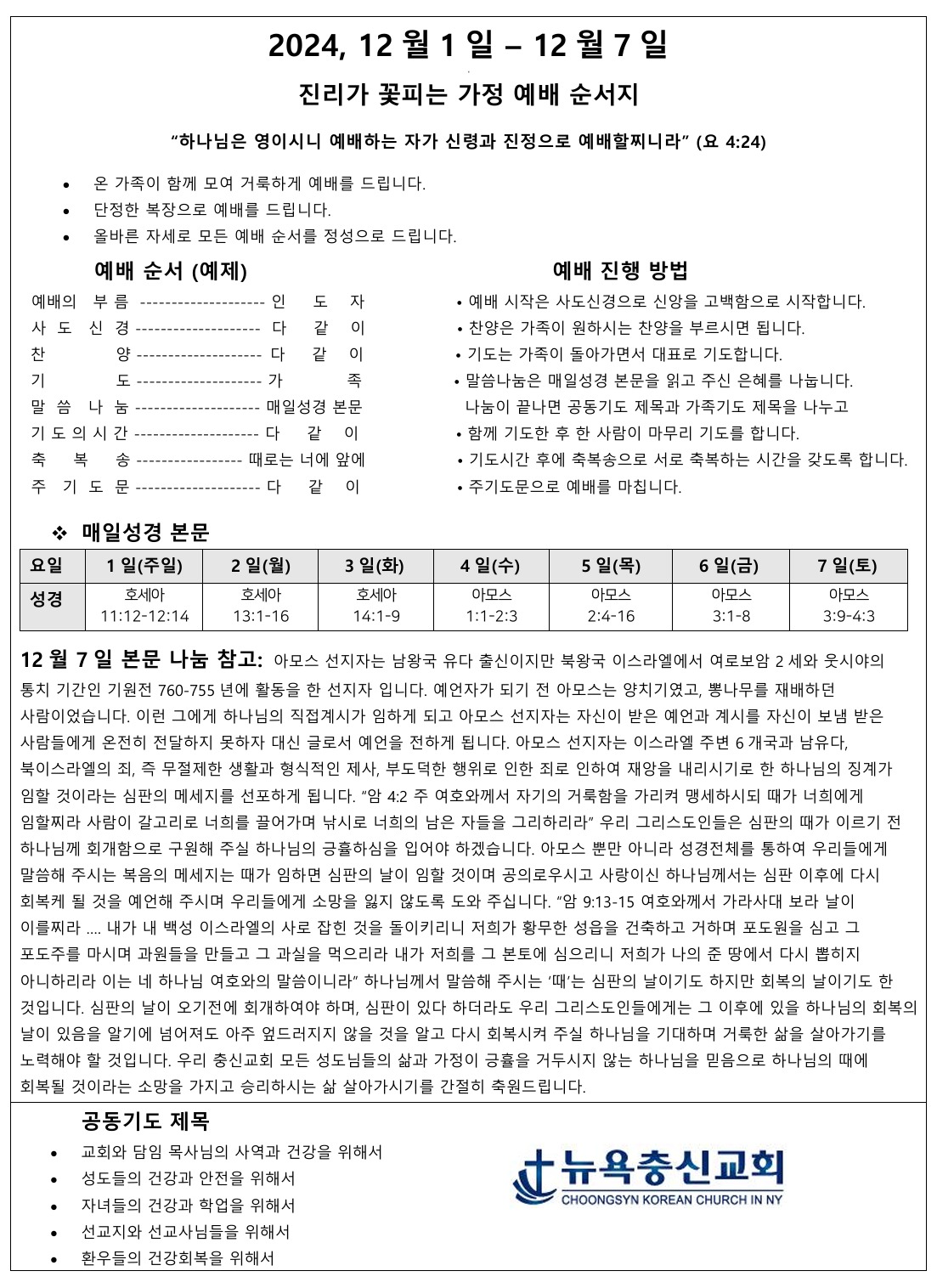 12월 1주차 가정예배지 Nov 30, 2024 0 Comment Post By:CSKC Share: Prev Next You Might Also Like 18 Oct 2025 0 10월 19일 주일예배 주보 11 Oct 2025 0 10월 12일 주일예배 주보 5 Oct 2025 0 한마음 10월 기도제목