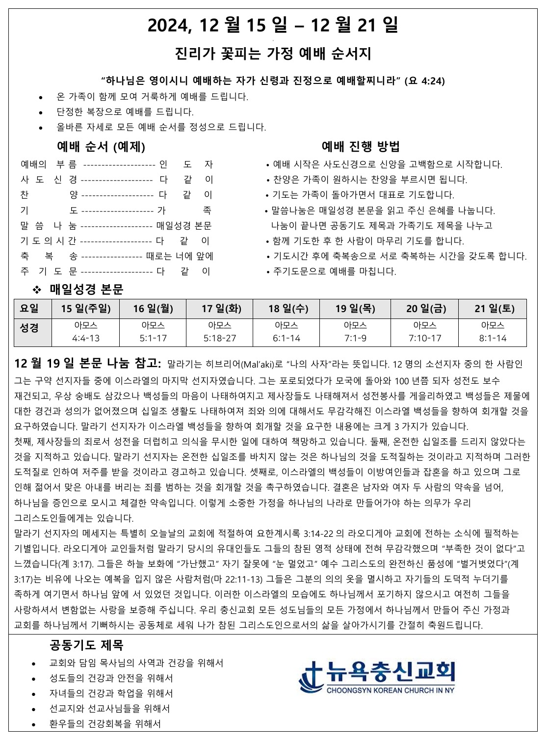 12월 3주차 가정예배지 Dec 14, 2024 0 Comment Post By:CSKC Share: Prev Next You Might Also Like 18 Oct 2025 0 10월 19일 주일예배 주보 11 Oct 2025 0 10월 12일 주일예배 주보 5 Oct 2025 0 한마음 10월 기도제목