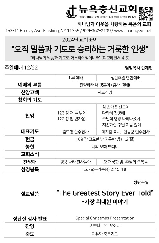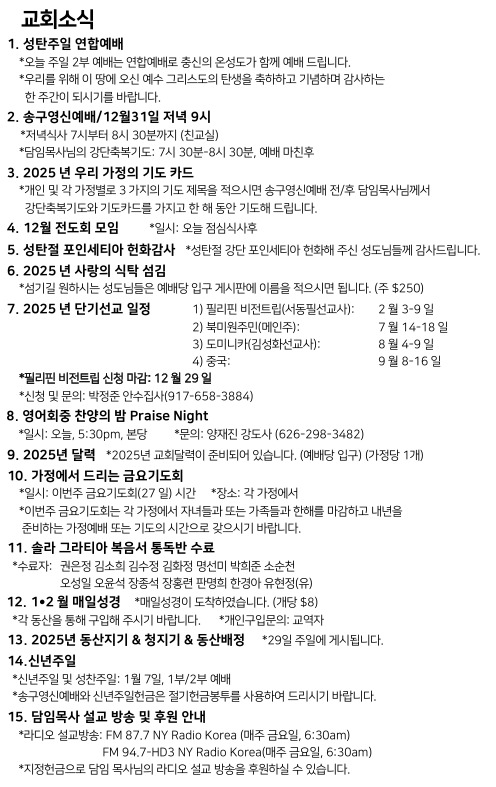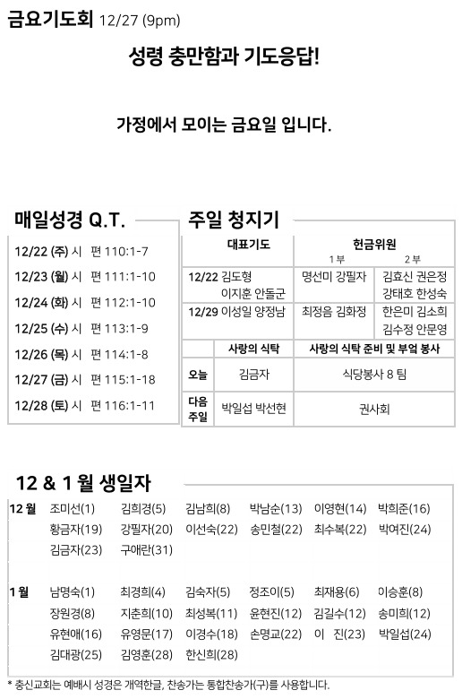 12월 22일 주일예배 주보 Dec 21, 2024 0 Comment Post By:CSKC Share: Prev Next You Might Also Like 18 Oct 2025 0 10월 19일 주일예배 주보 11 Oct 2025 0 10월 12일 주일예배 주보 5 Oct 2025 0 한마음 10월 기도제목