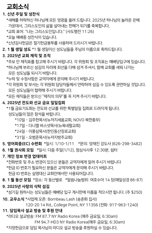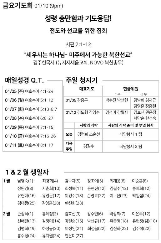 1월 5일 주일예배 주보 Jan 4, 2025 0 Comment Post By:CSKC Share: Prev Next You Might Also Like 18 Oct 2025 0 10월 19일 주일예배 주보 11 Oct 2025 0 10월 12일 주일예배 주보 5 Oct 2025 0 한마음 10월 기도제목