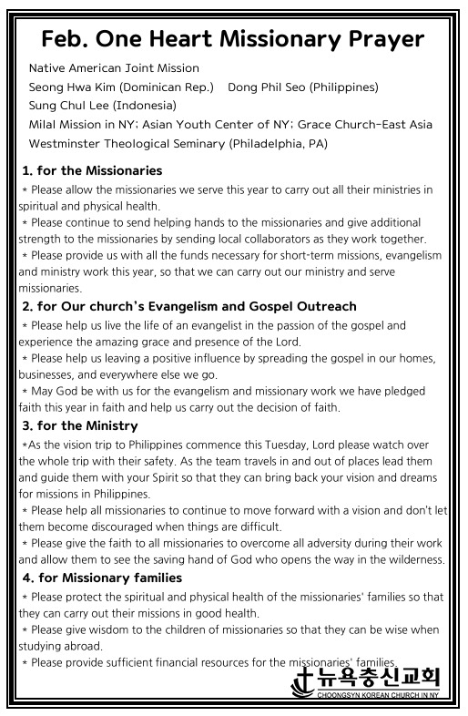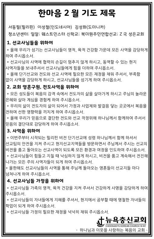 한마음 2월 기도제목 Feb 1, 2025 0 Comment Post By:CSKC Share: Prev Next You Might Also Like 18 Oct 2025 0 10월 19일 주일예배 주보 11 Oct 2025 0 10월 12일 주일예배 주보 5 Oct 2025 0 한마음 10월 기도제목