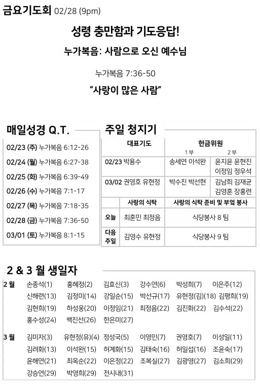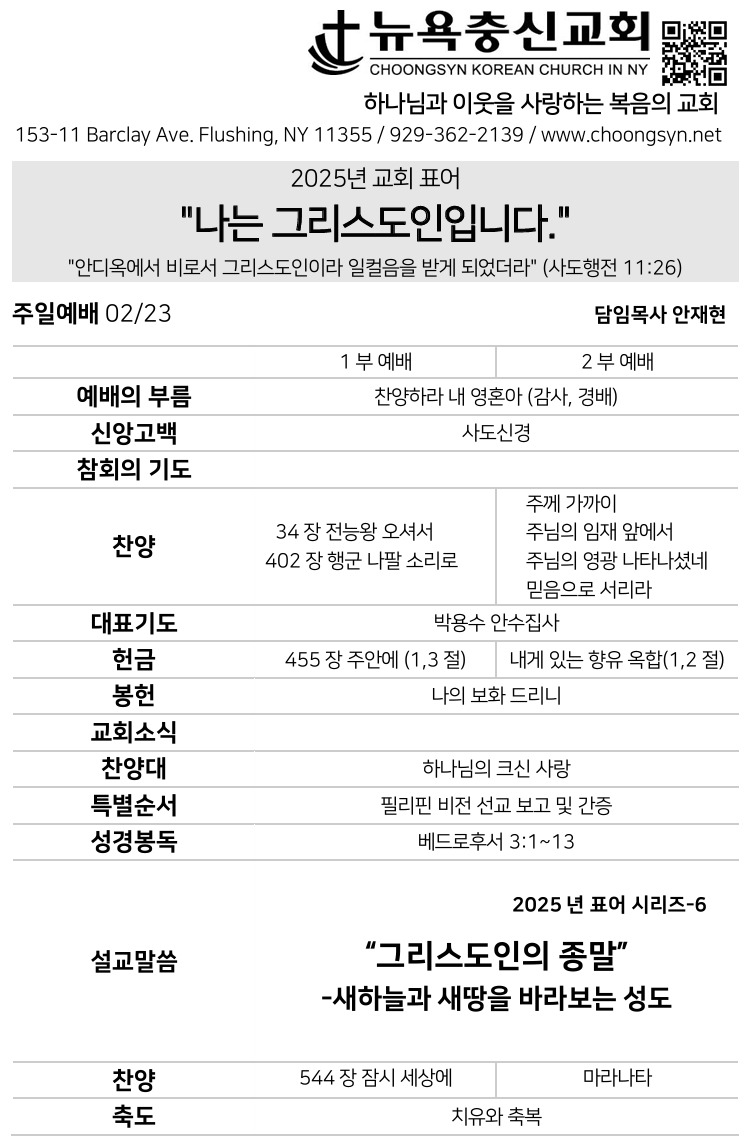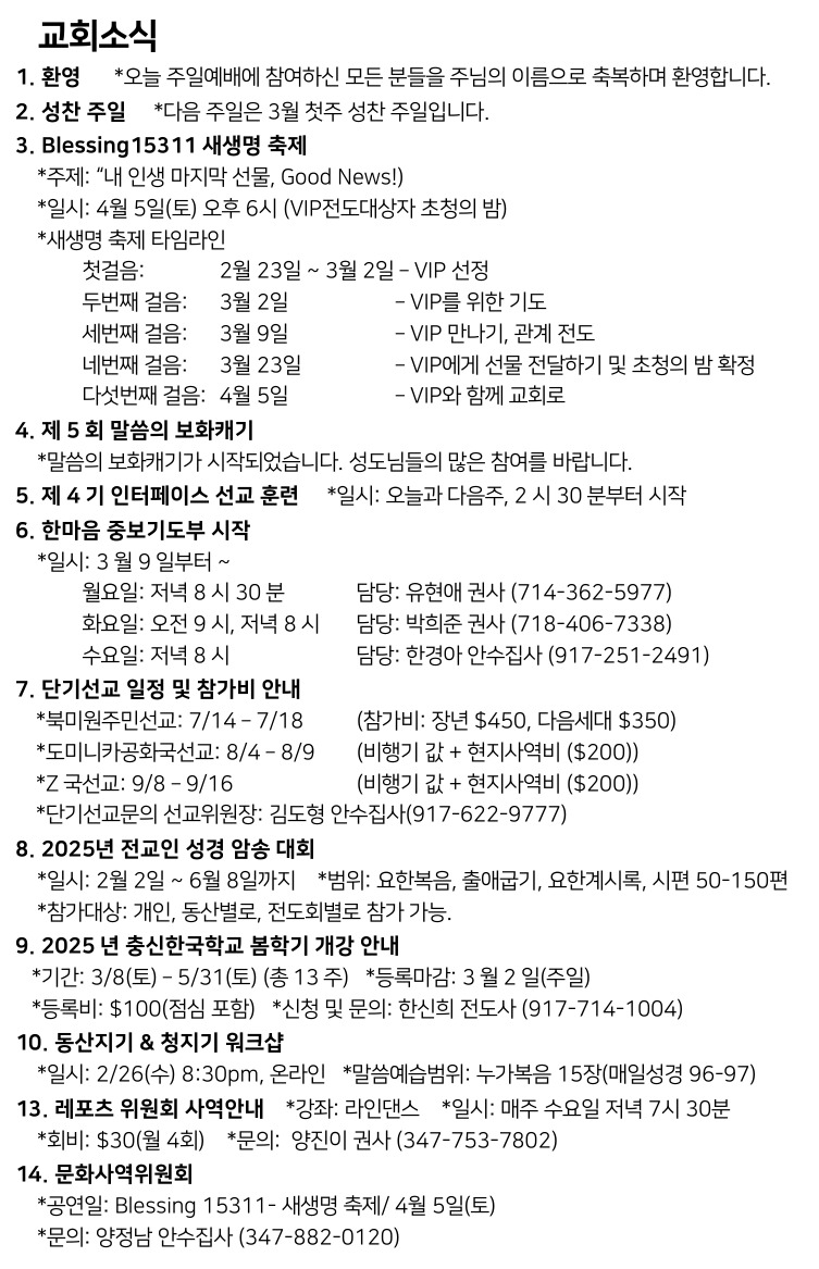 2월 23일 주일예배 주보 Feb 23, 2025 0 Comment Post By:CSKC Share: Prev Next You Might Also Like 18 Oct 2025 0 10월 19일 주일예배 주보 11 Oct 2025 0 10월 12일 주일예배 주보 5 Oct 2025 0 한마음 10월 기도제목