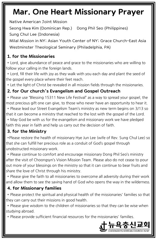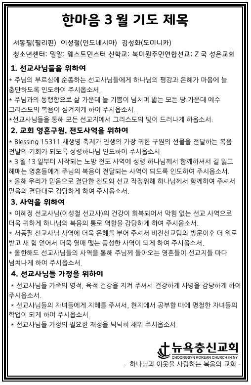 뉴욕충신교회 > 나눔 > 한마음 3월 기도제목