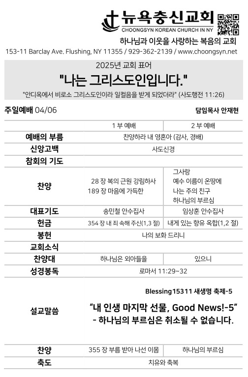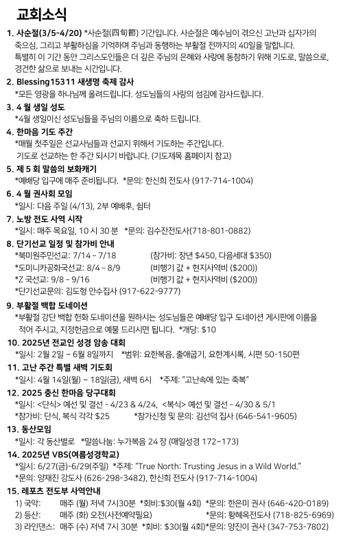 4월 6일 주일예배 주보 Apr 5, 2025 0 Comment Post By:CSKC Share: Prev Next You Might Also Like 18 Oct 2025 0 10월 19일 주일예배 주보 11 Oct 2025 0 10월 12일 주일예배 주보 5 Oct 2025 0 한마음 10월 기도제목