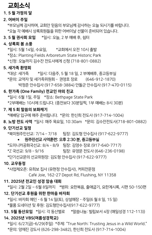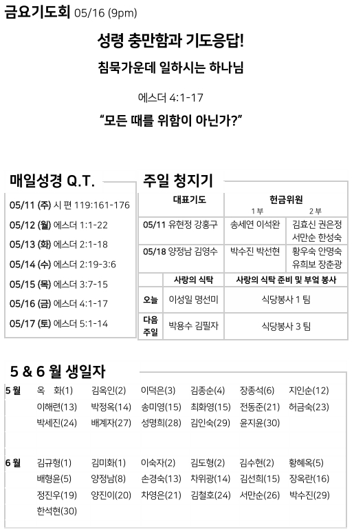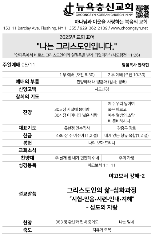 5월 11일 주일예배 주보 May 10, 2025 0 Comment Post By:CSKC Share: Prev Next You Might Also Like 18 Oct 2025 0 10월 19일 주일예배 주보 11 Oct 2025 0 10월 12일 주일예배 주보 5 Oct 2025 0 한마음 10월 기도제목