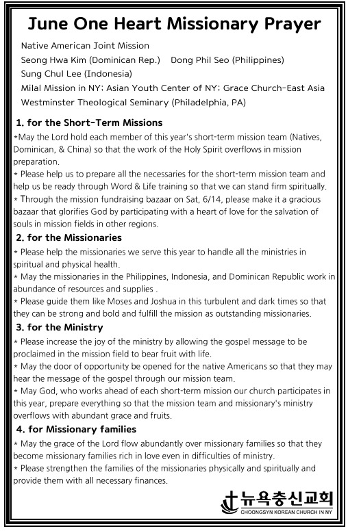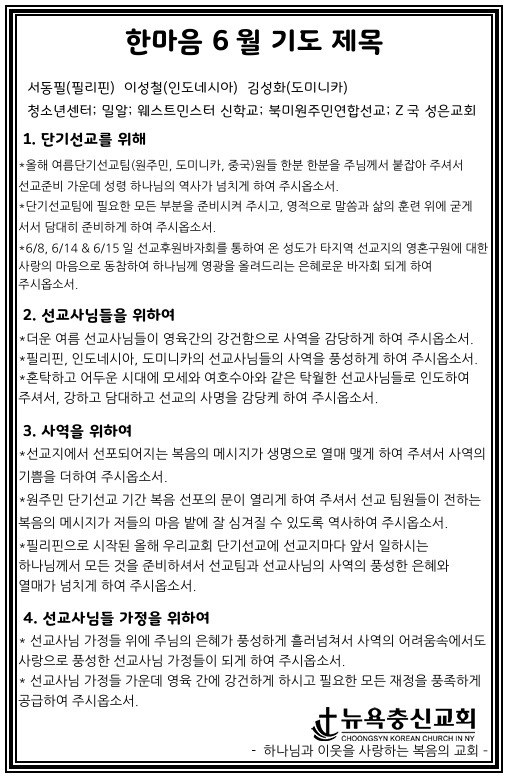 뉴욕충신교회 > 나눔 > 한마음 6월 기도제목