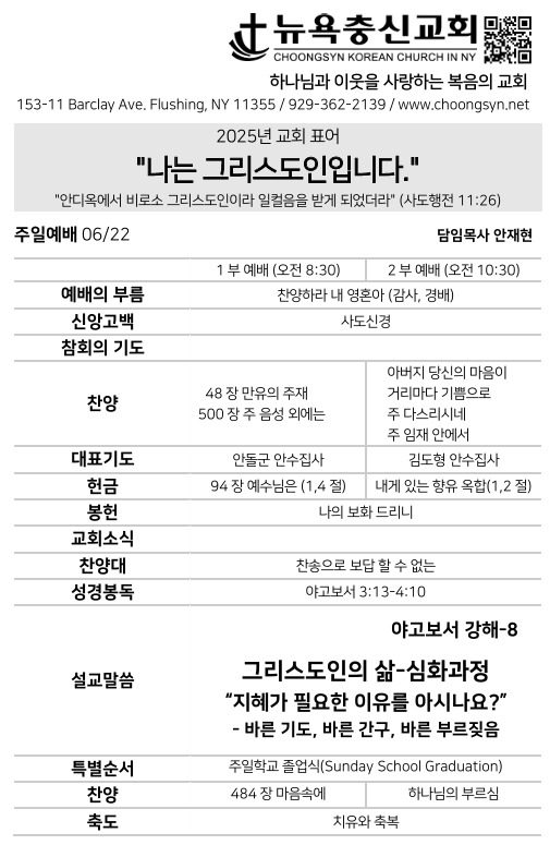 6월 22일 주일예배 주보 Jun 22, 2025 0 Comment Post By:CSKC Share: Prev Next You Might Also Like 18 Oct 2025 0 10월 19일 주일예배 주보 11 Oct 2025 0 10월 12일 주일예배 주보 5 Oct 2025 0 한마음 10월 기도제목