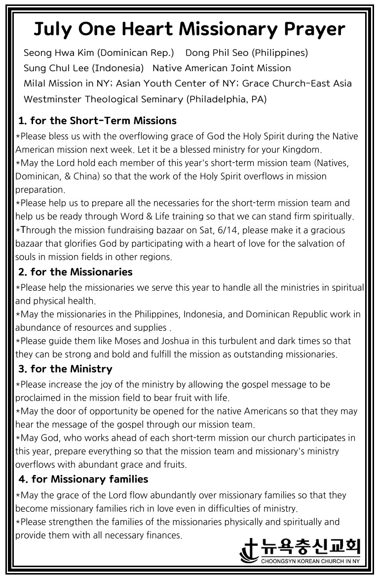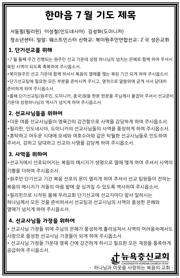 한마음 7월 기도제목 Jul 5, 2025 0 Comment Post By:CSKC Share: Prev Next You Might Also Like 18 Oct 2025 0 10월 19일 주일예배 주보 11 Oct 2025 0 10월 12일 주일예배 주보 5 Oct 2025 0 한마음 10월 기도제목