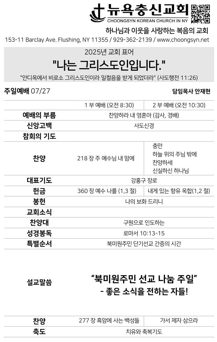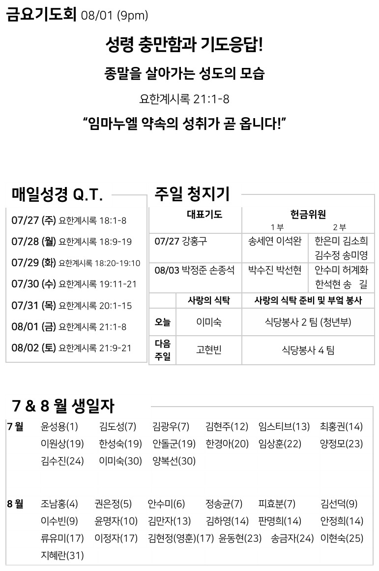 7월 27일 주일예배 주보 Jul 26, 2025 0 Comment Post By:CSKC Share: Prev Next You Might Also Like 18 Oct 2025 0 10월 19일 주일예배 주보 11 Oct 2025 0 10월 12일 주일예배 주보 5 Oct 2025 0 한마음 10월 기도제목