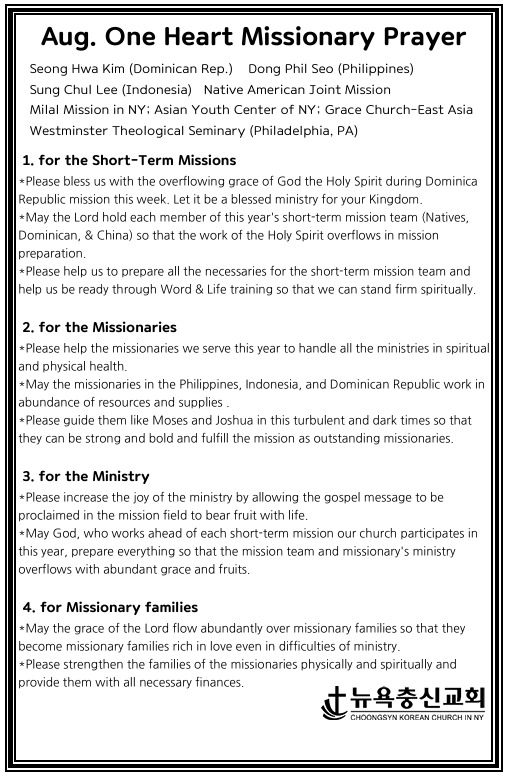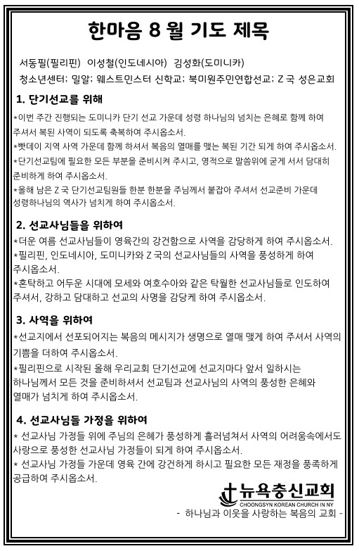 뉴욕충신교회 > 나눔 > 한마음 8월 기도제목