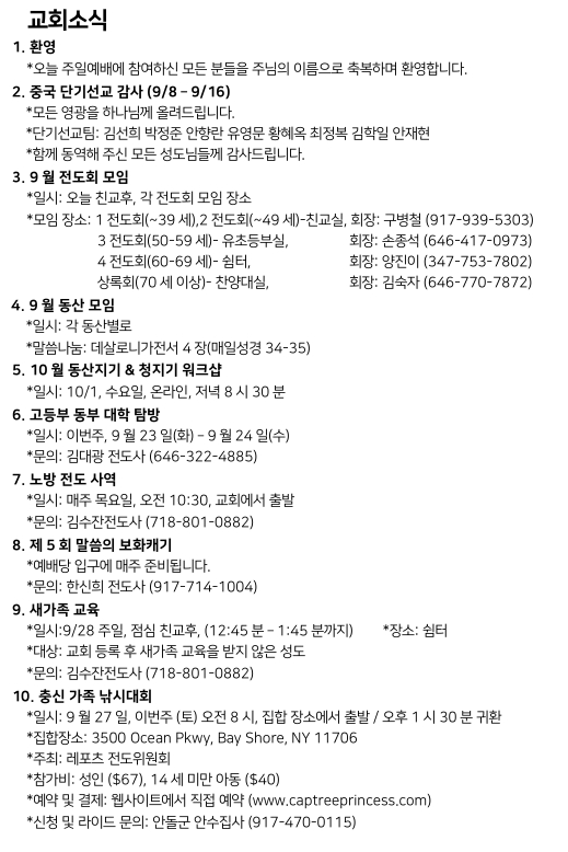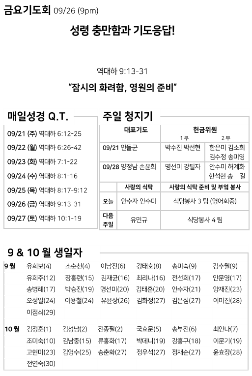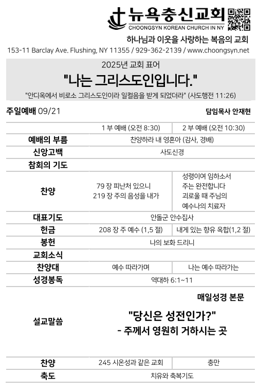 뉴욕충신교회 > 주보 > 9월 21일 주일예배 주보