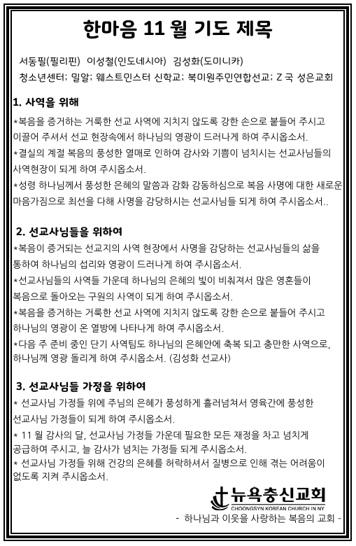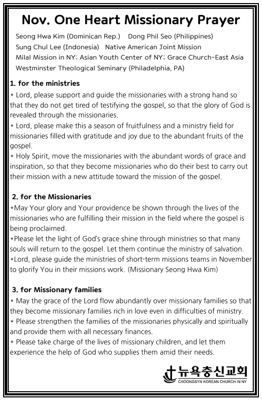 한마음 11월 기도제목 Nov 1, 2025 0 Comment Post By:CSKC Share: Prev You Might Also Like 1 Nov 2025 0 11월 2일 주일예배 주보 25 Oct 2025 0 10월 26일 주일예배 주보 18 Oct 2025 0 10월 19일 주일예배 주보