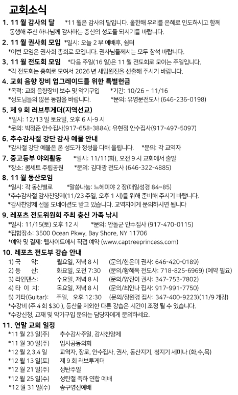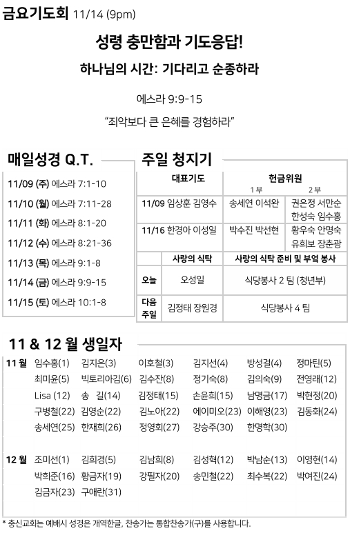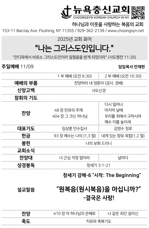 11월 9일 주일예배 주보 Nov 8, 2025 0 Comment Post By:CSKC Share: Prev Next You Might Also Like 31 Jan 2026 0 한마음 2월 기도제목 31 Jan 2026 0 2월 1일 주일예배 주보 17 Jan 2026 0 1월 25일 주일예배 주보