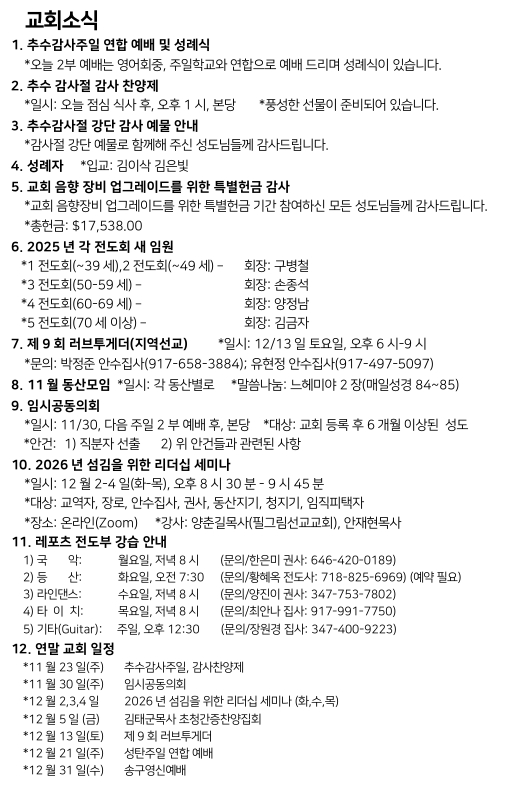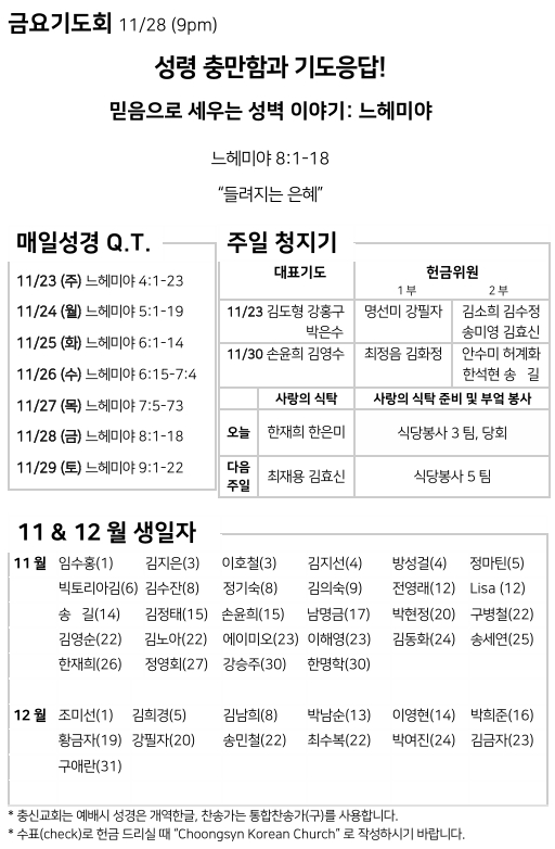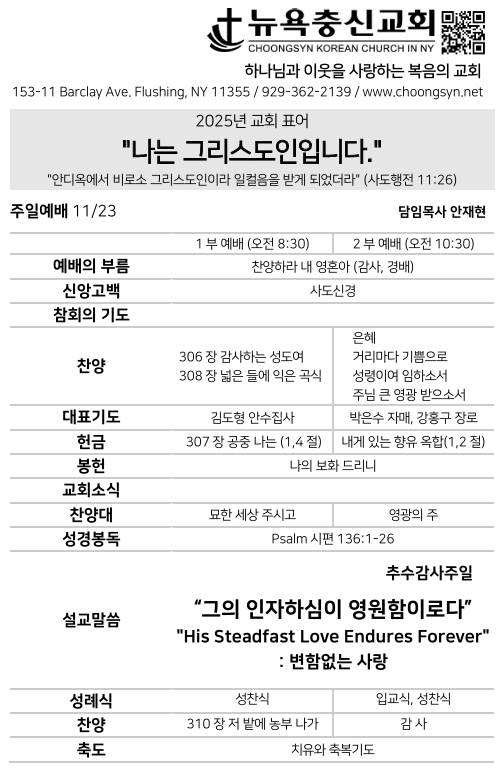 뉴욕충신교회 > 주보 > 11월 23일 주일예배 주보