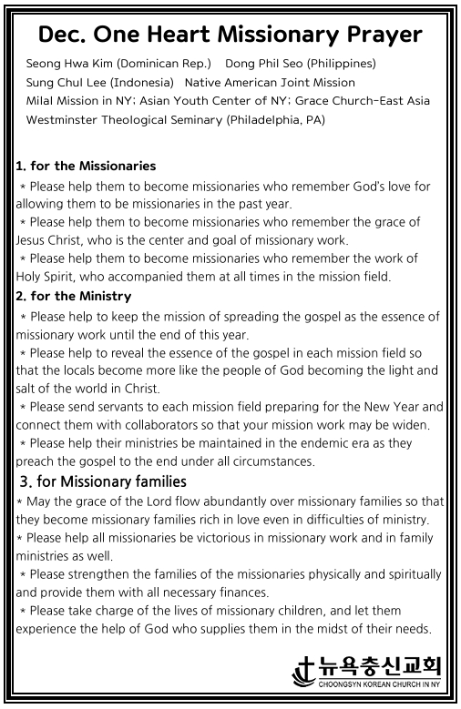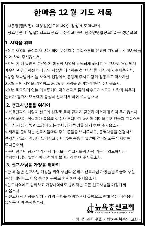 한마음 12월 기도제목 Dec 6, 2025 0 Comment Post By:CSKC Share: Prev Next You Might Also Like 31 Jan 2026 0 한마음 2월 기도제목 31 Jan 2026 0 2월 1일 주일예배 주보 17 Jan 2026 0 1월 25일 주일예배 주보