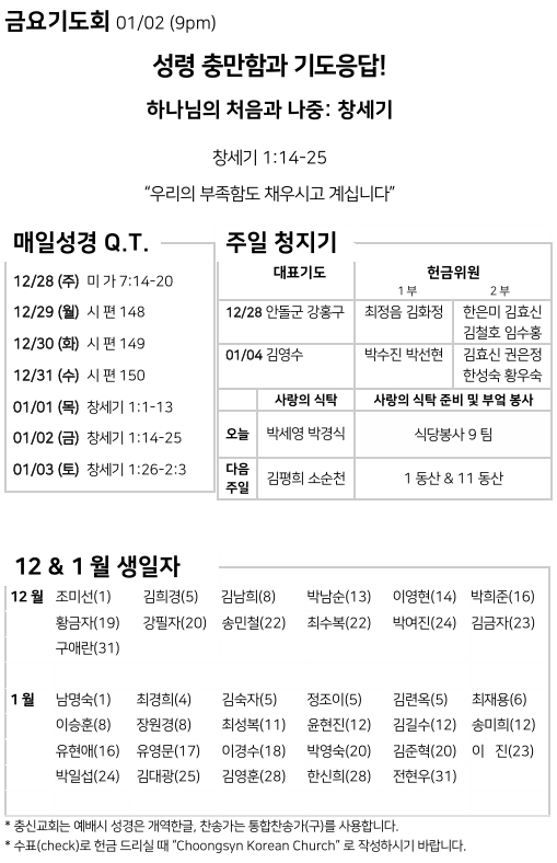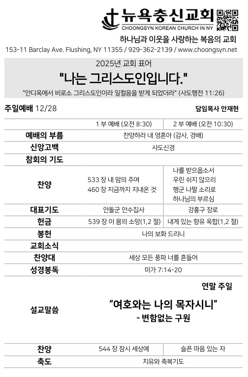 뉴욕충신교회 > 주보 > 12월 28일 주일예배 주보