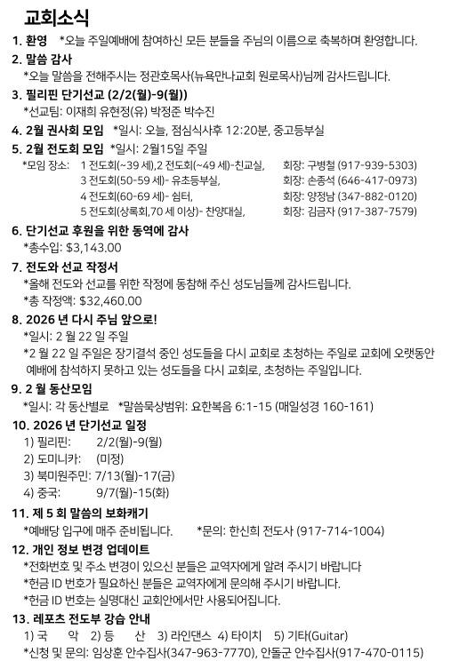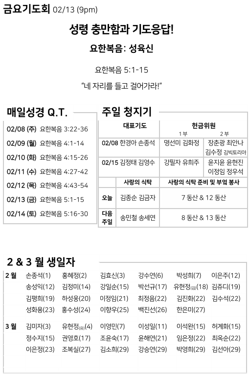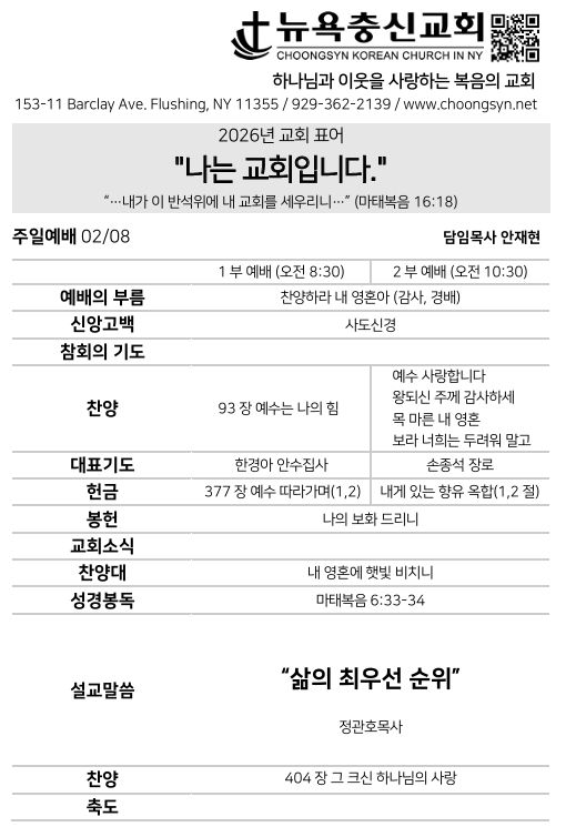 2월 8일 주일예배 주보 Feb 7, 2026 0 Comment Post By:CSKC Share: Prev Next You Might Also Like 21 Feb 2026 0 2월 22일 주일예배 주보 14 Feb 2026 0 2월 15일 주일예배 주보 31 Jan 2026 0 한마음 2월 기도제목