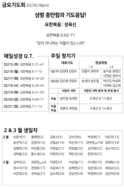 2월 15일 주일예배 주보 Feb 14, 2026 0 Comment Post By:CSKC Share: Prev Next You Might Also Like 21 Feb 2026 0 2월 22일 주일예배 주보 7 Feb 2026 0 2월 8일 주일예배 주보 31 Jan 2026 0 한마음 2월 기도제목