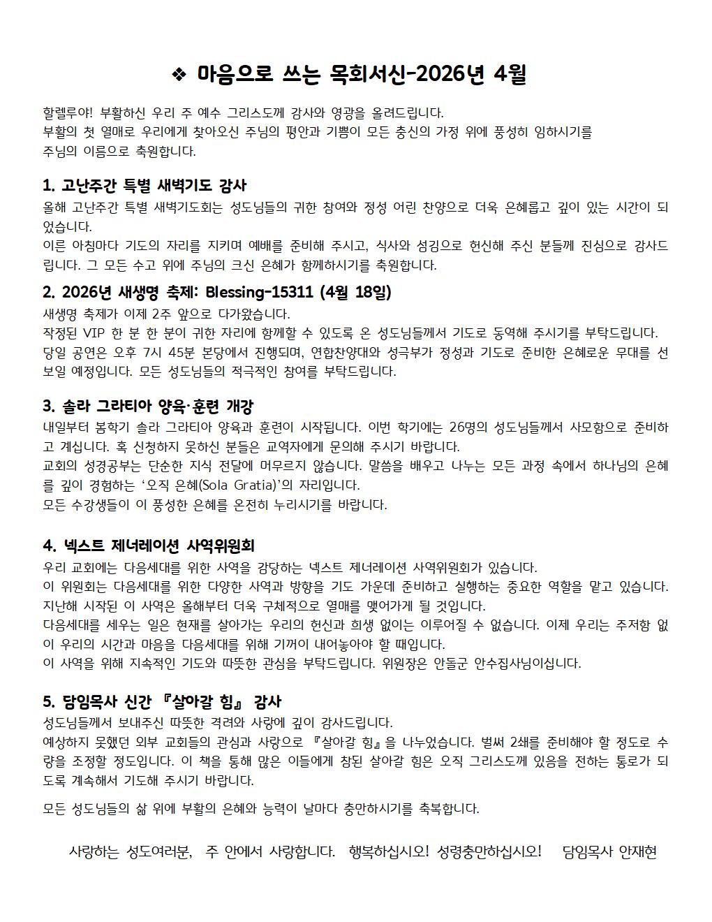 4월 마음으로 쓰는 목회서신 Apr 5, 2026 0 Comment Post By:CSKC Share: Prev You Might Also Like 4 Apr 2026 0 4월 5일 주일예배 주보 4 Apr 2026 0 한마음 4월 기도제목 29 Mar 2026 0 3월 29일 주일예배 주보