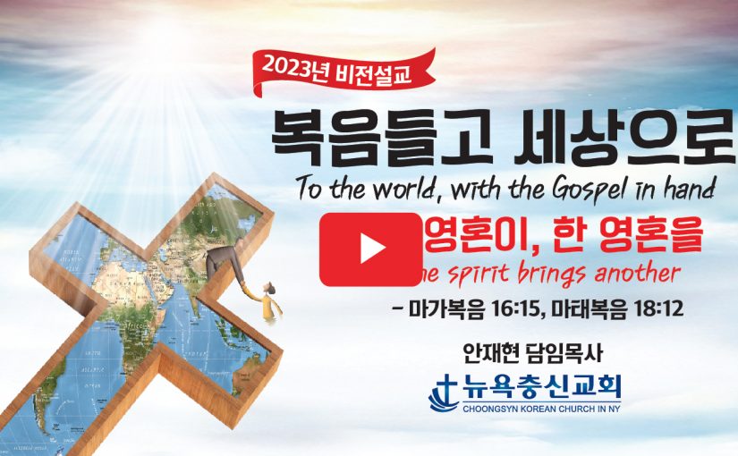 1월 1일 주일예배 말씀Feb 1, 2023 Feb 1, 2023 0 Comment Post By:CSKC Speakers: 안재현 담임목사 (마가복음 16:15) 15 또 가라사대 너희는 온 천하에 다니며 만민에게 복음을 전파하라 ( 마태복음 18:12) 12 너희 생각에는 어떻겠느뇨 만일 어떤 사람이 양 일백 마리가 있는데 그 중에 하나가 길을 잃었으면 그 아흔 아홉 마리를 산에 두고 가서 길 잃은 양을 찾지 않겠느냐 Share: Prev Next You Might Also Like 18 Oct 2025 0 10월 19일 주일예배 주보 11 Oct 2025 0 10월 12일 주일예배 주보 5 Oct 2025 0 한마음 10월 기도제목